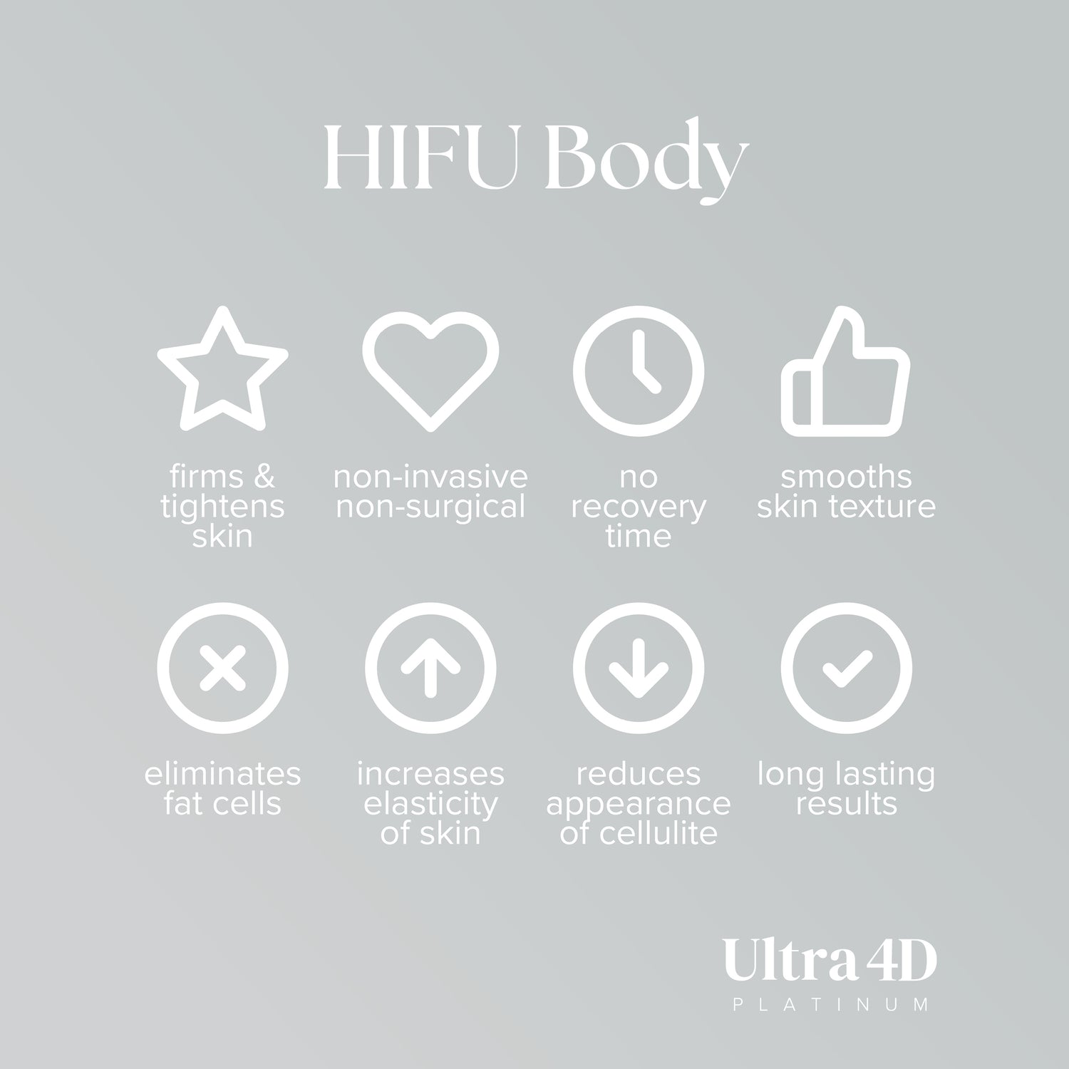 We understand that it's not just your face that needs attention when it comes to our treatments. Our HIFU body treatments are also non-invasive, non-surgical procedures that help firm & tighten your skin.